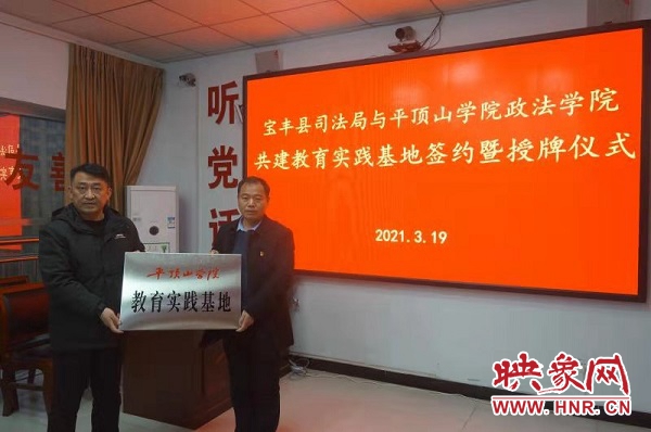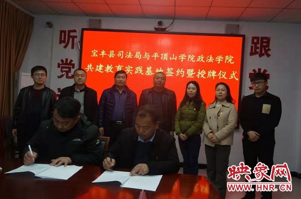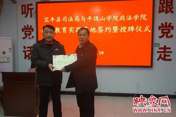 签约仪式上,张晓东代表beat365中文官网与牛志刚局长在共建教育实践基地协议书上签字;为宝丰县司法局授予“教育实践基地”匾牌;为牛志刚、岳朝军两位同志颁发了客座教授聘书。