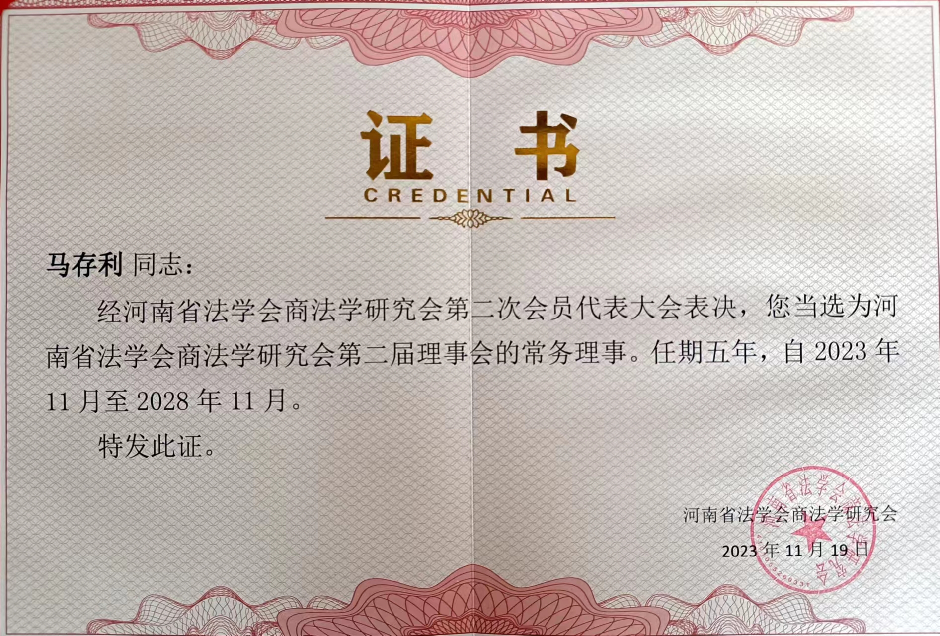 会议选举产生了河南省法学会商法学研究会第二届理事会,大会选举产生了会长、秘书长、理事等理事会组成人员。公司马存利博士当选河南省法学会商法学研究会常务理事,徐健博士当选河南省法学会商法学研究会理事。