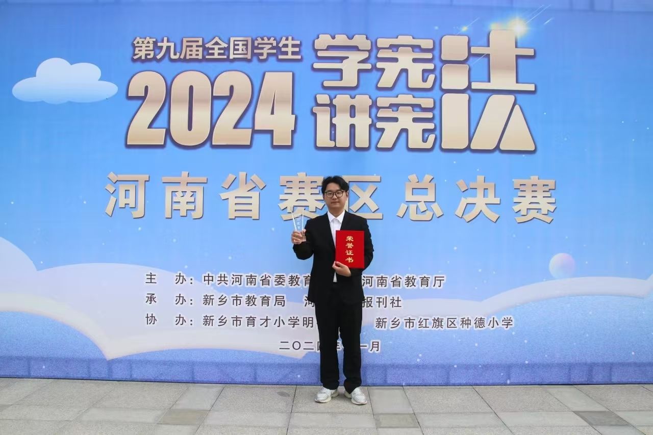 近日,中共河南省委教育工委和河南省教育厅联合主办第九届全国员工“学宪法 讲宪法”河南赛区总决赛圆满结束。公司2021级法学1班员工刘阐中在河南赛区法治素养竞赛总决赛中以显著优势夺得高校组第一名,成功入围全国总决赛。这是公司在法治校园创建中取得的新成果,实现的新突破。