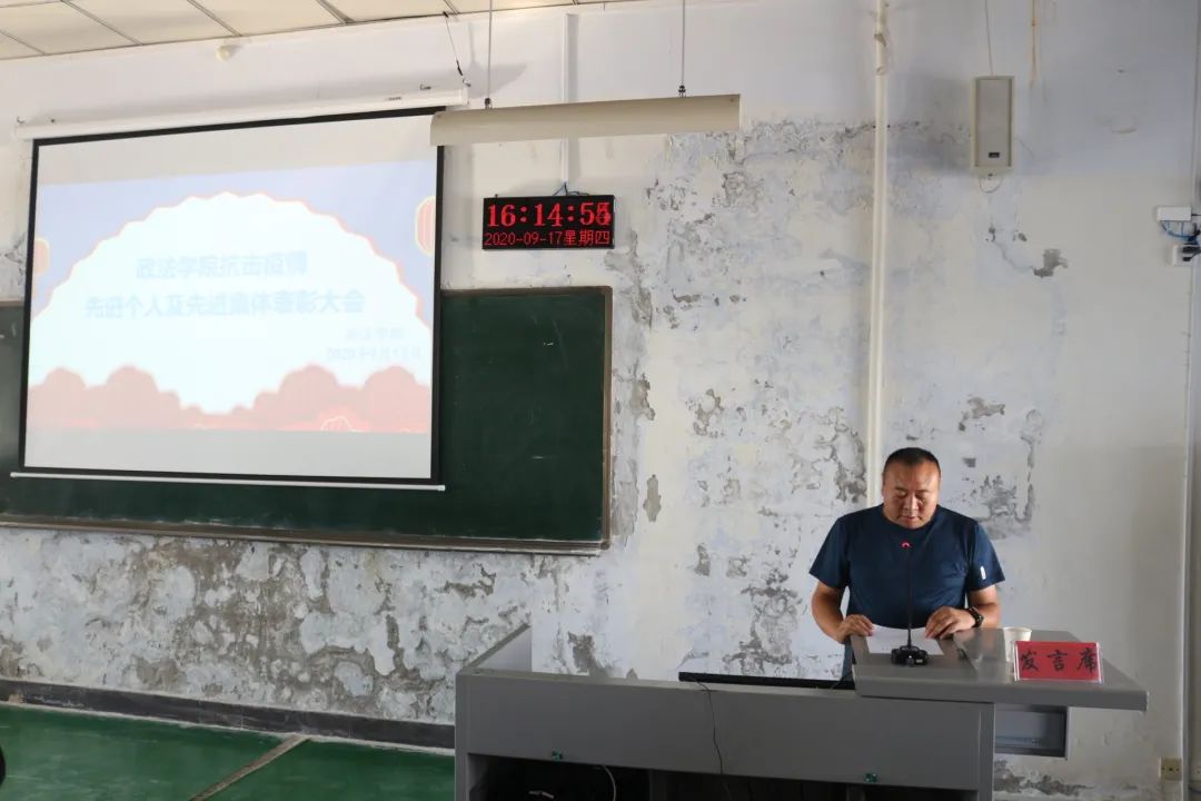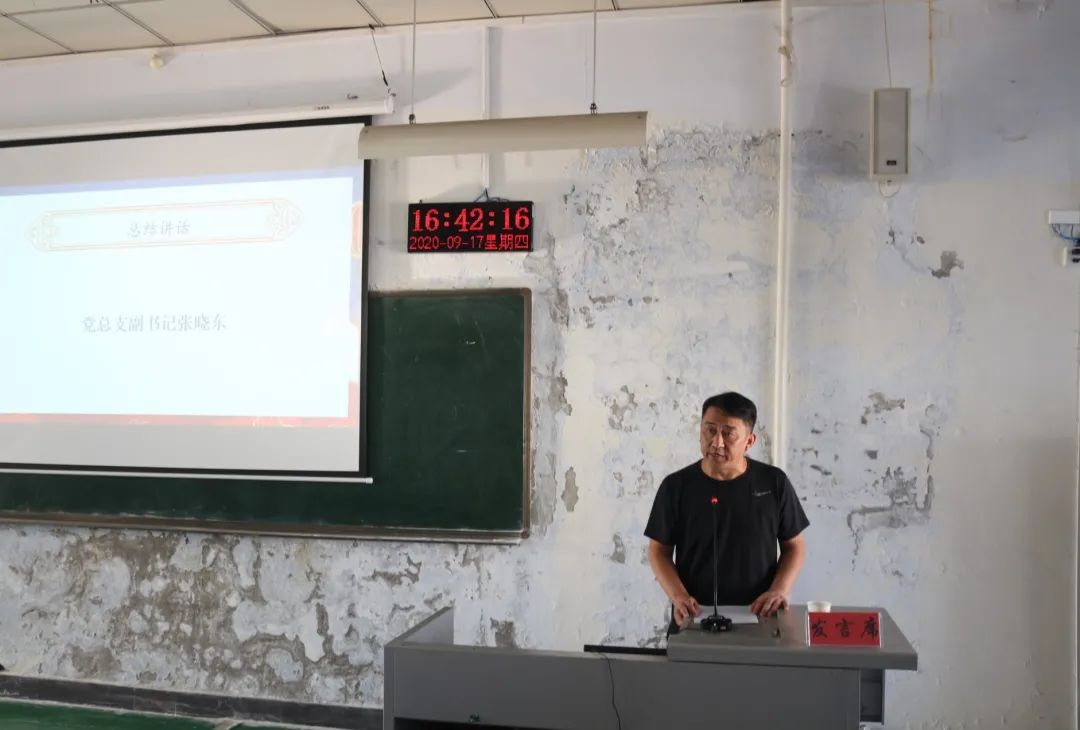 最后,党总支副书记张晓东书记为本次大会做总结讲话,他对在抗击疫情工作中做出突出贡献的先进个人和集体给予了高度赞扬,并倡导同学们向他们学习,同时张晓东老师也提出,目前疫情尚未结束,在校仍要遵守公司规定,减少走动,不出校门不聚集,保护好自身的生命财产安全。