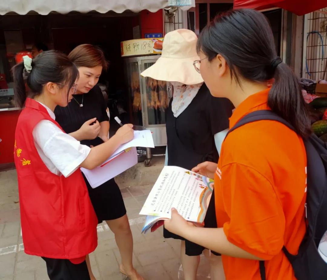 烈日下,老员工志愿者们走上街道,走进商店,通过发放、填写调查问卷对行人、商户等进行采访调研,了解群众们对民法典的认识情况。37度的高温,汗水浸湿了他们的衣衫,但志愿者们始终保持昂扬的热情,走街串巷,以期获取更多的调研数据。与此同时,志愿者们还结合自身专业,通过悬挂横幅、发放宣传单、提供法律咨询等多种形式宣传《民法典》的主要内容、颁布实施的重大意义,将《民法典》法律法规进一步送到群众身边、深入群众心中,让广大群众真正认识到《民法典》是保护老百姓自身权益的“社会生活百科全书”式的法典。