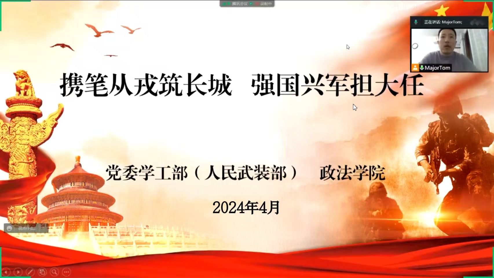 为进一步贯彻落实公司征兵工作相关要求,帮助毕业生拓宽就业渠道,鼓励毕业生应征入伍,6月1日晚,公司采用线上方式组织开展以“携笔从戎筑长城,强国兴军担大任”为主题的征兵政策宣讲会,辅导员马延明担任主讲,2020级全体同学参加了会议。