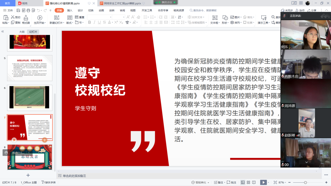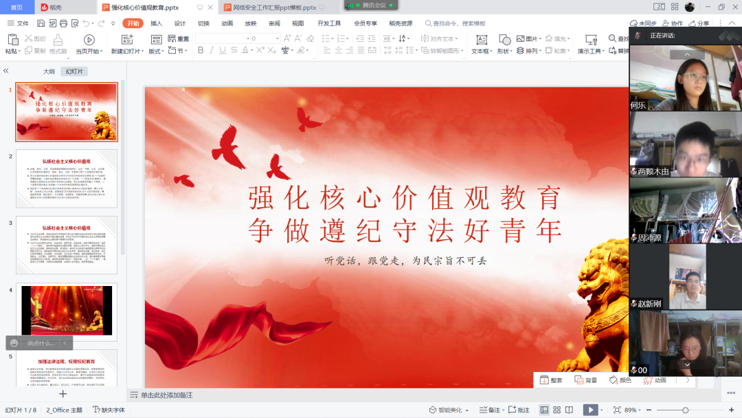 为贯彻落实“培育和践行社会主义核心价值观”的理论,切实把社会主义核心价值体系融入青年思想教育,进一步学习习近平法治思想,增强团员的法治意识和法治观念,并在新学期重新学习公司校规校纪与疫情防控要求,营造和谐稳定的校园环境,同时帮助同学们增强网络安全防范意识和自我防范能力。公司积极响应公司号召,以团支部为单位组织开展“强化核心价值观教育,争做遵纪守法好青年”“网络安全为人民,网络安全靠人民”主题团日活动,各团支部于9月8日下午在线上组织开展了此次团日活动。