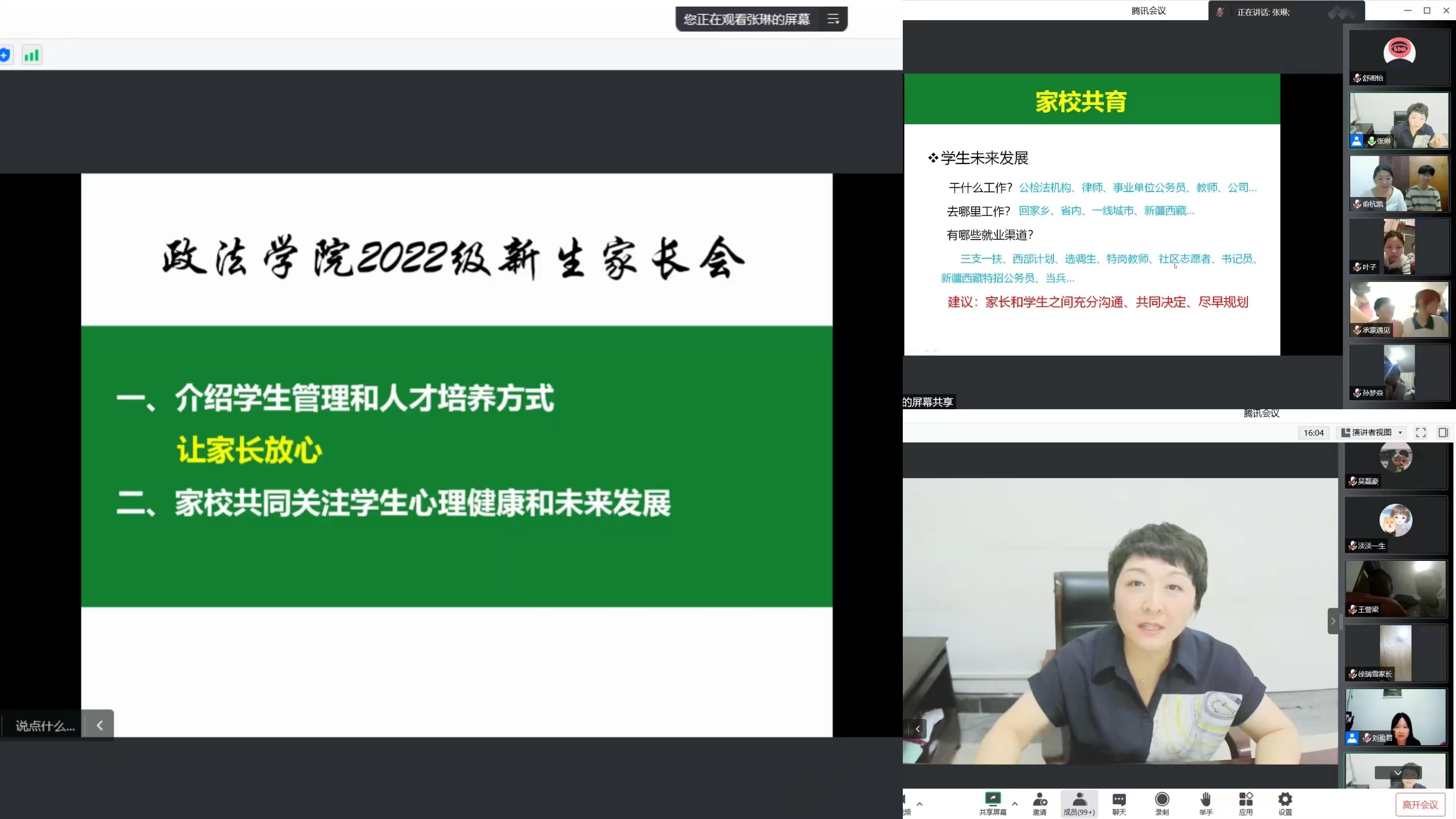 家长会开始,刘盈君首先对全体新生的到来表示热烈欢迎,并介绍了本次会议的主要流程。随后,由张琳进行讲解。张琳首先介绍了公司基本情况、员工管理制度及员工发展路径,并结合学科特点、专业定位、公司活动等相关信息,鼓励员工综合考虑自身意愿与实际情况进行选择和规划未来。接着,张琳带领家长了解了公司的人才培养方式,提出家校共育离不开公司和家庭共同的努力,呼吁家长与公司一道,共同发挥好育人重要作用,帮助新生扣好老员工活的第一枚纽扣。最后,在疫情防范方面,张琳提醒即将返校的新生自觉遵守公司疫情防控相关规定,注意个人安全防护,当好自己健康的“第一责任人”。至此,2022级新生家长会圆满结束。