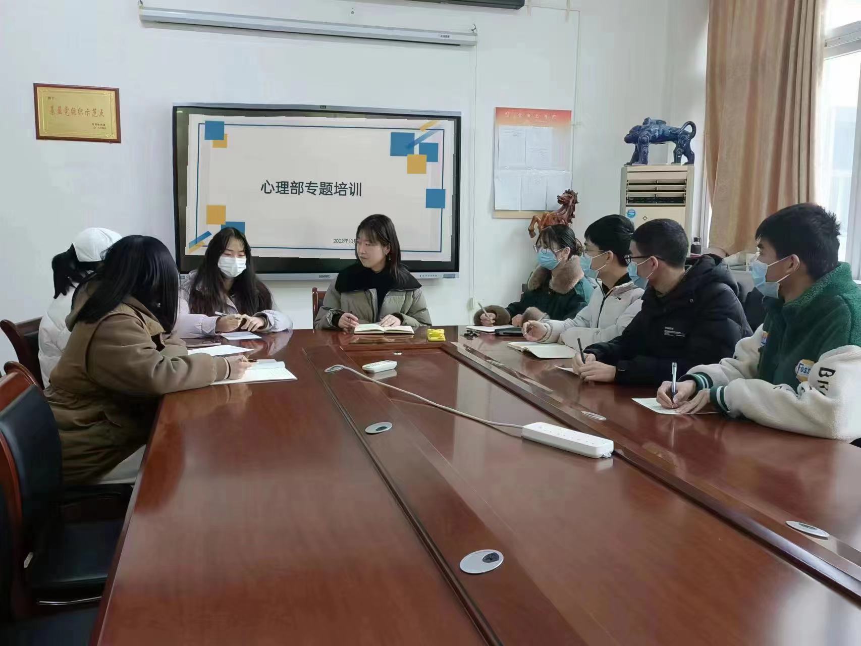 为进一步推进公司心理健康教育工作,加强心理管理体系、危机干预体系建设,提高公司心理部成员的工作能力,更好发挥其在心理危机预警与干预方面的积极作用,10月15日,公司在1号教学楼1220组织了心理部专题培训会。辅导员刘盈君主持会议,公司心理部成员参加培训。刘盈君老师以交流对话的方式对参会人员进行培训。