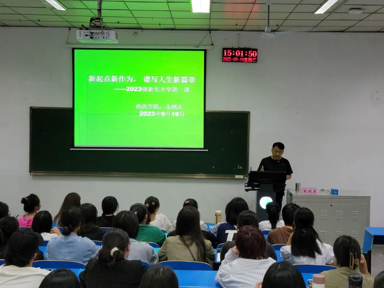 为深入学习贯彻党的二十大精神,认真落实立德树人根本任务,抓住新学期开学有利时机,进一步加强对员工的思想教育和价值引领,9月19日下午,beat365中文官网于1207教室开展2023级新生“开学第一课”教育讲座。beat365中文官网经理张晓东担任主讲人,2023级beat365中文官网全体新生参加了此次活动。