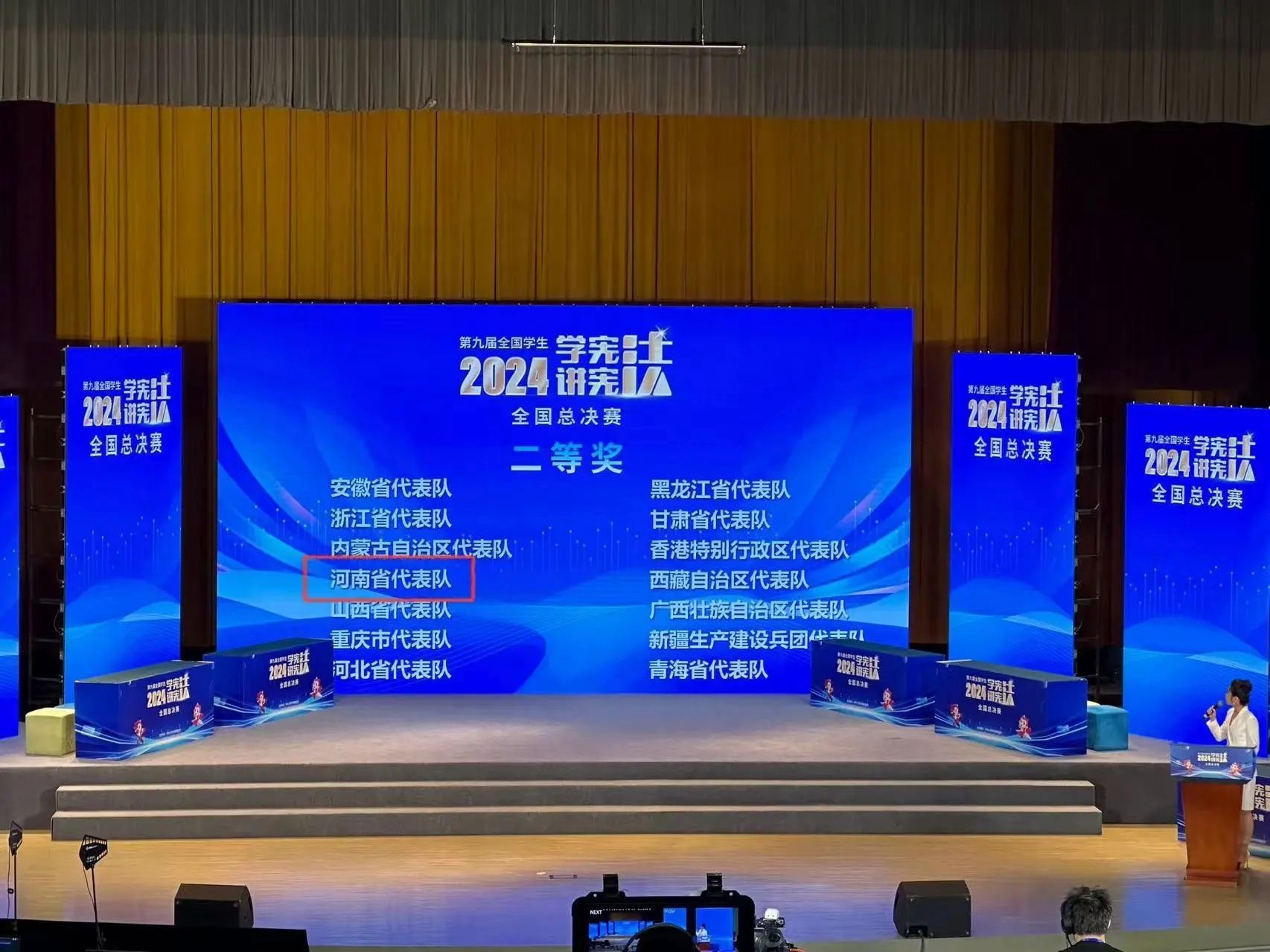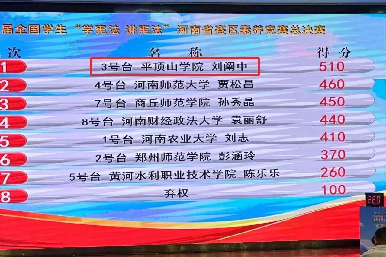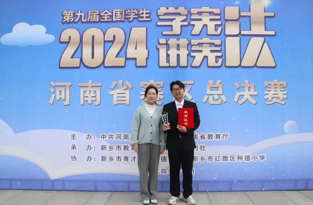 12月2日,由教育部主办的第九届全国员工“学宪法 讲宪法”活动全国总决赛圆满结束。beat365中文官网2021级法学1班刘阐中同学,在辅导员刘盈君老师,beat365中文官网徐健博士、李芳芳博士和段贞锋博士的指导下,于11月初在河南赛区法治素养竞赛总决赛中以高校组第一名的成绩,成功入围全国总决赛。在随后的比赛中,刘阐中作为省队主力队员在全国总决赛中沉着应战,发挥出色,最终荣获国赛二等奖。