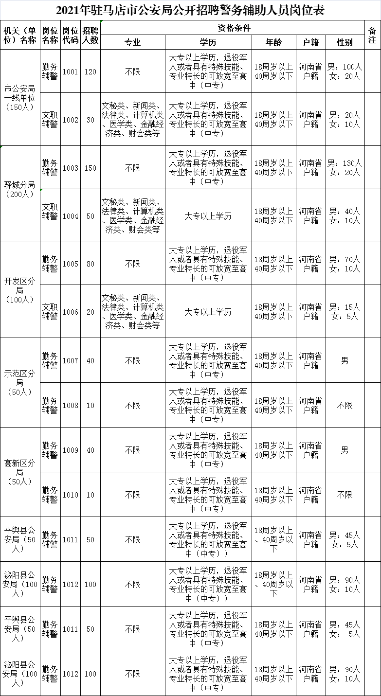 根据《河南省警务辅助人员条例》有关规定,驻马店市公安局根据工作需要,经驻马店市人民政府批准,面向社会公开招聘700名警务辅助人员。现公告如下:
