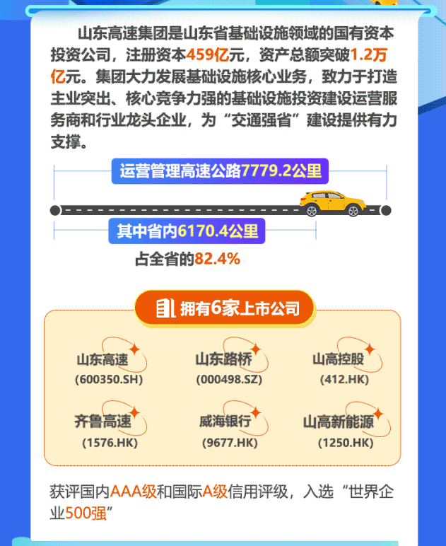 截至目前,山东高速集团运营管理高速公路7779.2公里,其中省内6170.4公里,占全省的82.4%;拥有山东高速(600350.SH)、山东路桥(000498.SZ)、山高控股(412.HK)、齐鲁高速(1576.HK)、威海银行(9677.HK)、山高新能源(1250.HK)6家上市公司;获评国内AAA级和国际A级信用评级,入选“世界企业500强”。