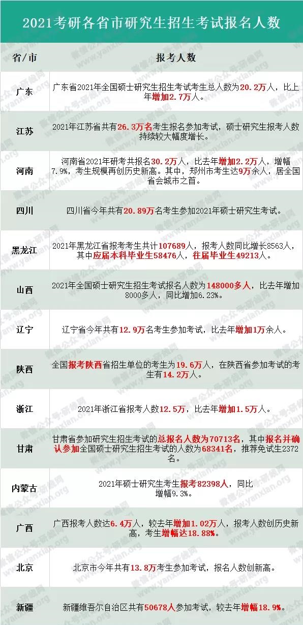 而广西、新疆等华南、西北地区省市2021考研报名人数也有较大幅度增长,让小编不禁想起去年新疆大学调剂“神仙打架”的场面。