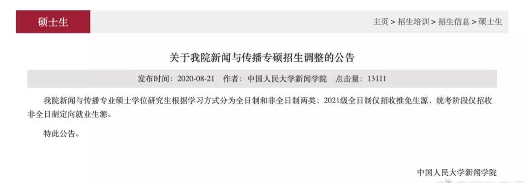 中国人民大学官网发布了新闻公司新闻与传播专业硕士招生调整的公告,2021级全日制仅招收推免生源,统考阶段仅招收非全日制定向就业生源。