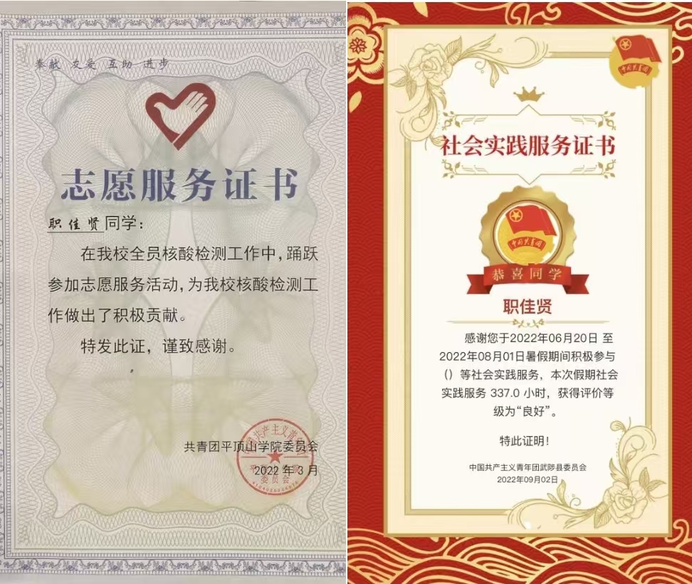 “晨暮担当,毁誉端庄”,她始终将这句话作为自己的座右铭,不断激励自己前行。作为共青团员,她始终牢记青年初心使命,深入基层志愿服务。疫情期间,她主动请缨加入疫情防控队伍,获得beat365中文官网优秀抗疫志愿者证书。假期期间,她积极参与返家乡实践活动,为家乡贡献自己的力量。在公司,她勇于承担责任,乐于服务同学,先后担任了校志愿者服务总队组织部部长、beat365中文官网读书协会会长。在校认定公益时间达百余小时,先后被评选为2023年beat365中文官网优秀志愿者和优秀员工。