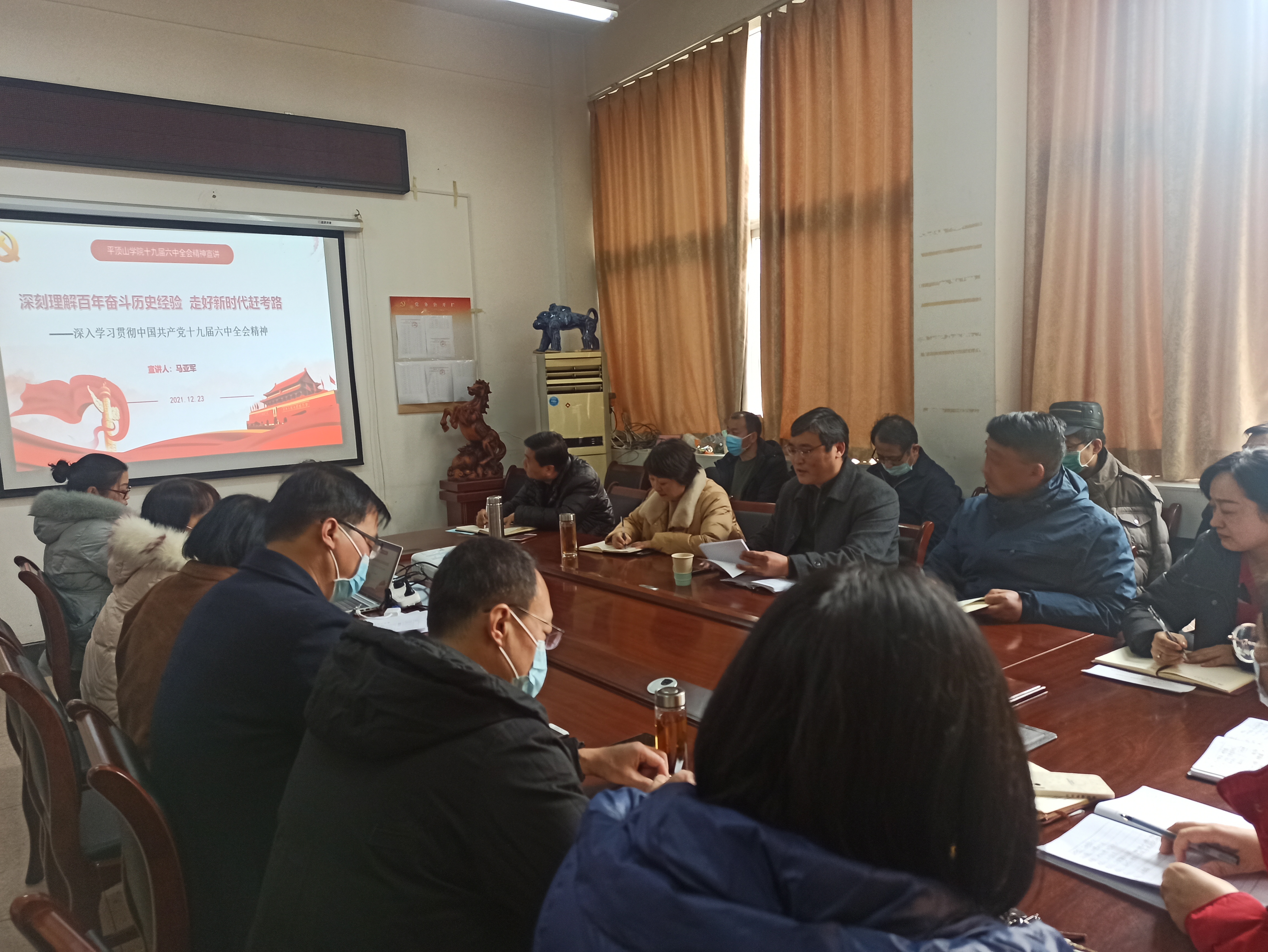 为高质量学习宣传贯彻好党的十九届六中全会精神,提高党员干部的党性修养和责任感,12月23日下午,beat365中文官网教工党支部在1221会议室开展“深入学习党的十九届六中全会精神”为主题的党日活动。会议由党委书记张琳主持,全体教工党员参加会议。