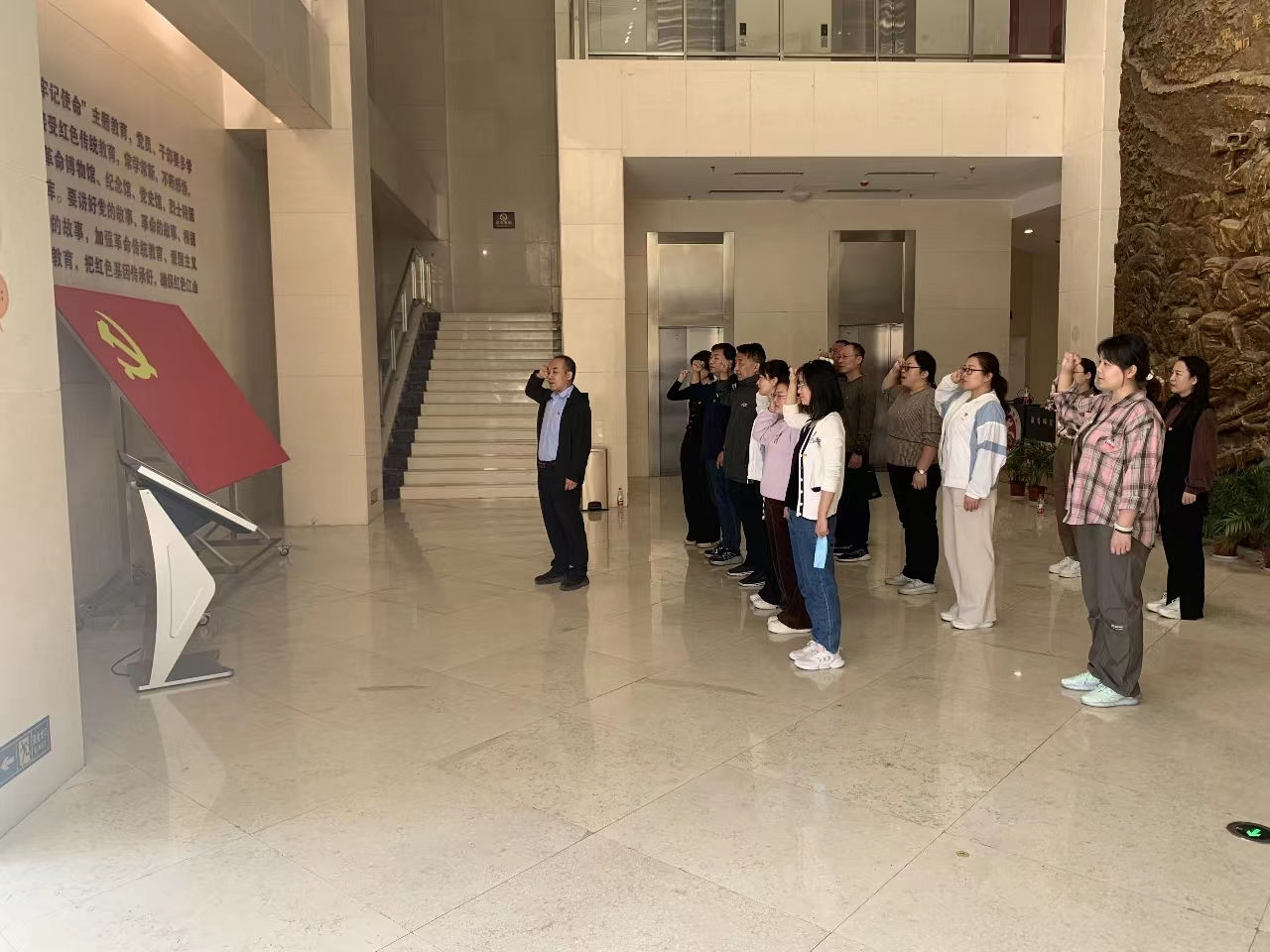 随后,在到达中原解放纪念馆后,党员同志们在党旗下重温入党誓词,认真聆听了刘伯承、邓小平等老一辈革命家在解放中原战斗中挺进中原、进驻宝丰、巩固中原、宝丰会议、经略中原、走向淮海的革命事迹,参观了革命先烈当时战斗生活的图片、实物,回顾了那段坎坷的革命历程,深刻体会了解放战争年代先辈们浴血奋战、不怕牺牲、勇往直前的革命斗争精神。